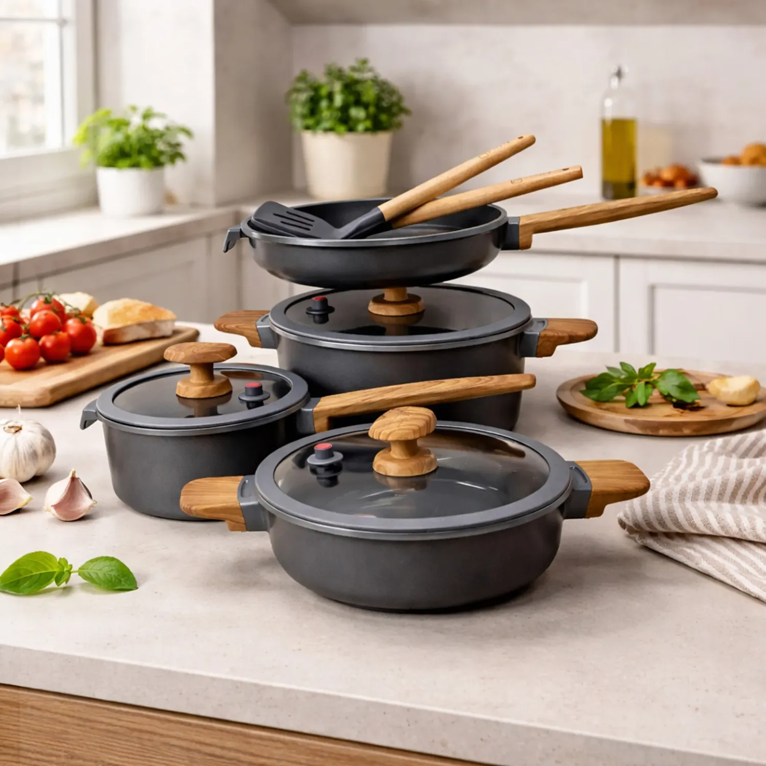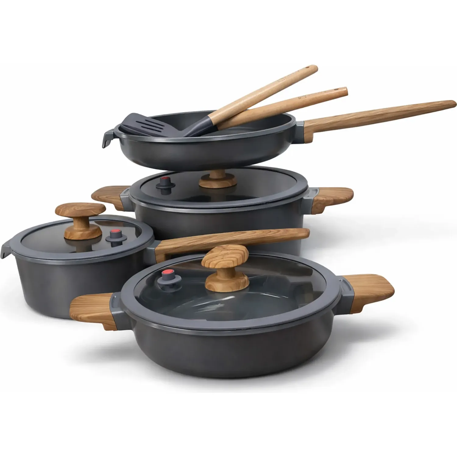 Juego De Ollas X 9 Pz Con Resvestimiento De Cerámica ( Cac.18+olla24+olla Baja24+sart.24+cuchar+esp)