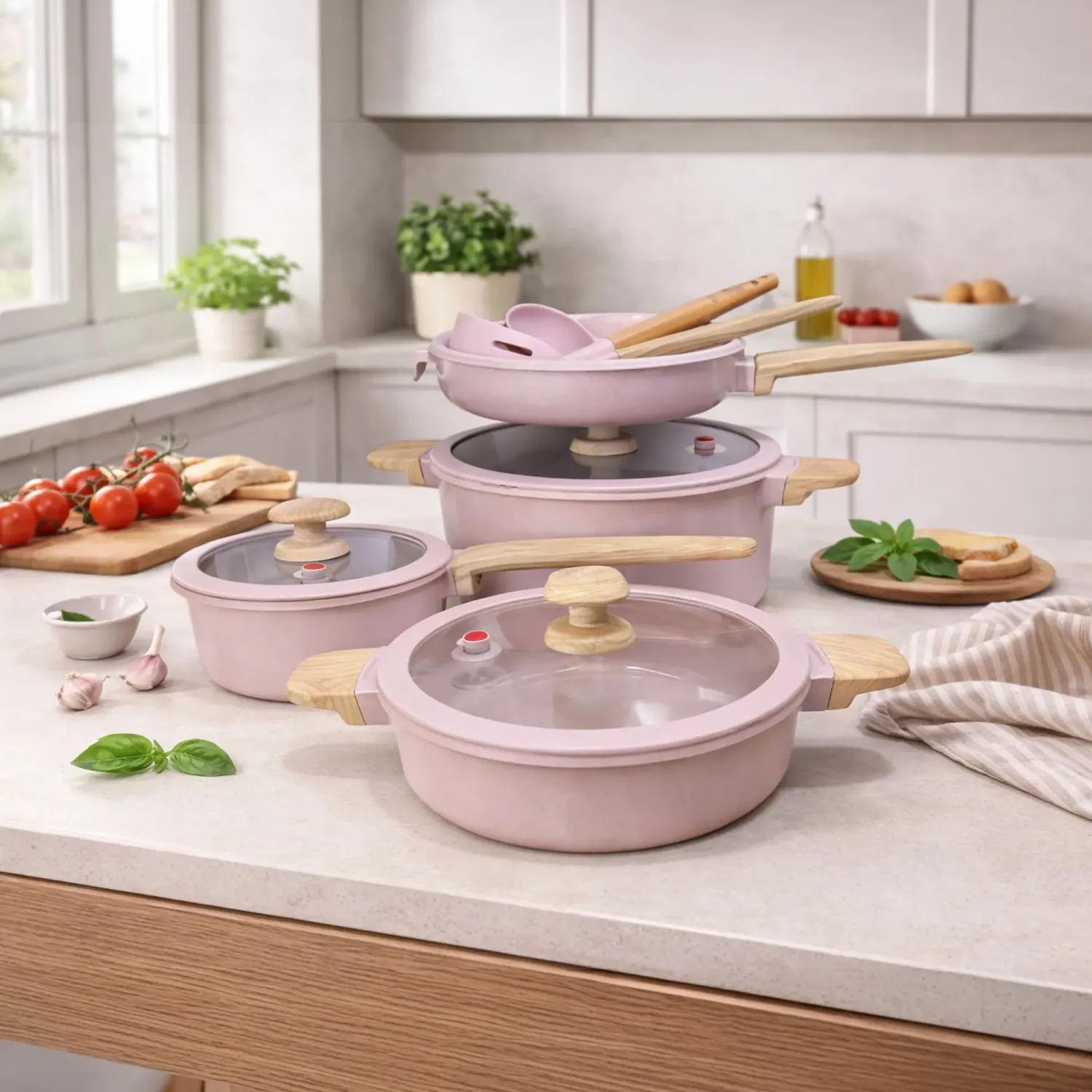 Juego De Ollas X 9 Pz Con Resvestimiento De Cerámica ( Cac.18+olla24+olla Baja24+sart.24+cuchar+esp)