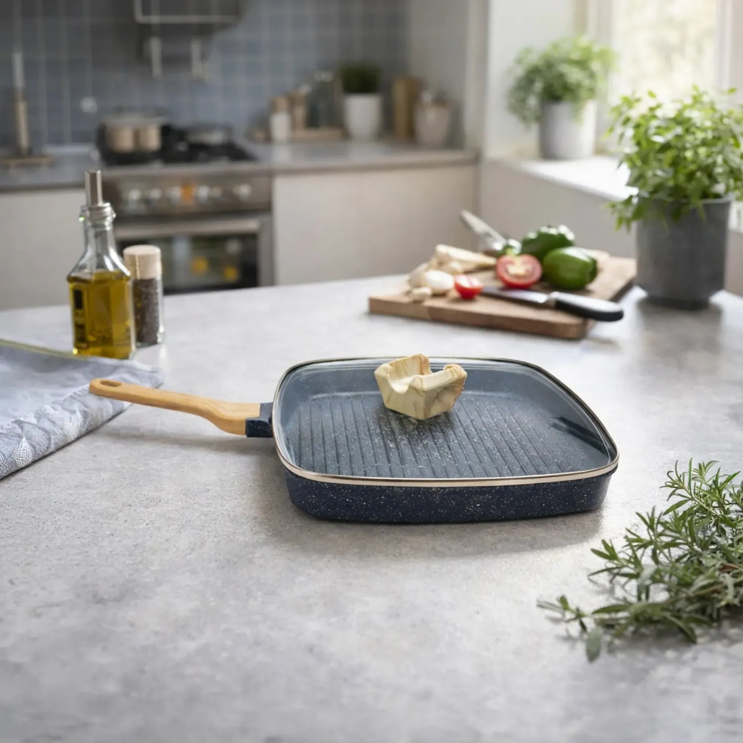 • Sarten Grill Cuadrada Con Tapa De Vidrio Color Gris De 28 Cm 1